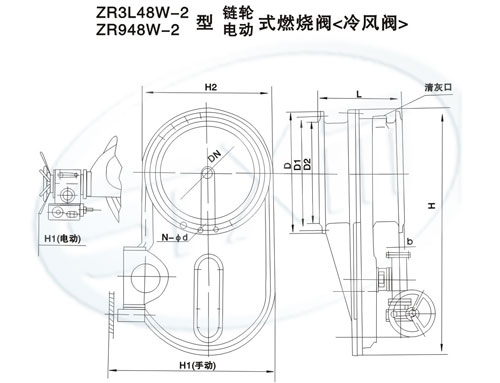 ZR3L48W-2型链轮式燃烧阀(冷风阀)基本结构与ZR748W-2型相同。用环链通过蜗轮付驱动闸板实现启闭。可在离管道一定距离的位置操作。ZR948W-2型电动式燃烧阀(冷风阀)采用电动装置通过机械执行机构驱动闸板启闭。本阀可以远距离控制。