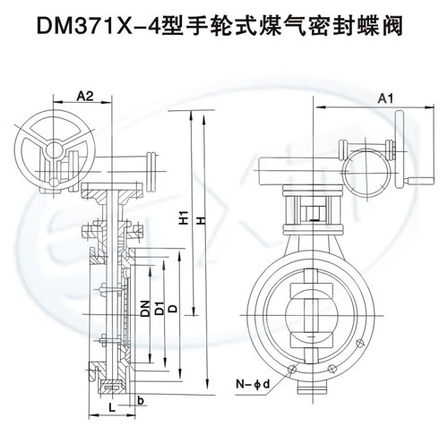 DM371X-4型手轮式煤气密闭蝶阀用手轮通过蜗轮付驱动蝶板完成启闭动作。密封圈采用蝶板夹持,密封圈与阀体密封带形成软密封形式,密封可靠。本阀蜗轮箱盖上装有指针,可供现场观察蝶板工作位置。本阀可任意位置安装无方向性。