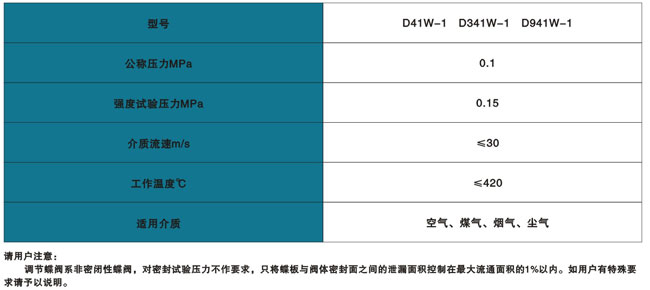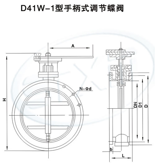D41W-1型手柄式调节蝶阀利用手柄转动蝶板完成有级调节开度的作业。手柄上有7个弧形齿孔,每孔间隔15°。蝶板转到一定位置用定位螺栓卡入齿孔关旋紧,用以固定蝶板的工作位置。蝶板启闭角度为0°、15°、30°、45°、60°、75°、90°。