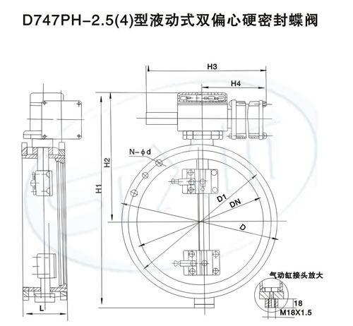 D747PH-2.5(4)型液动双偏心硬密封蝶阀采用液动装置驱动蝶板完成启闭动作。蝶板的启闭位置可通过传动箱盖上的行程开关进行信号显示。本阀适用于远距离控制场合。
