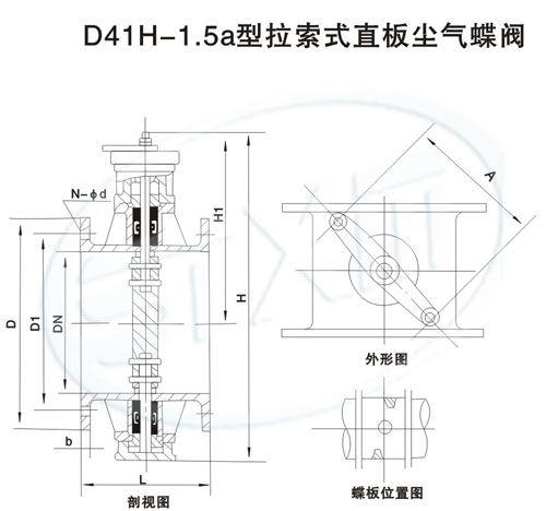 D41H-1.5a型拉索式直板尘气蝶阀,适宜在离阀门适当距离的位置上,用手动卷扬机或其他驱动装置通过绳索的牵引完成阀门的启闭。本阀安装于水平管道时请参照图中所示确定安装方向。