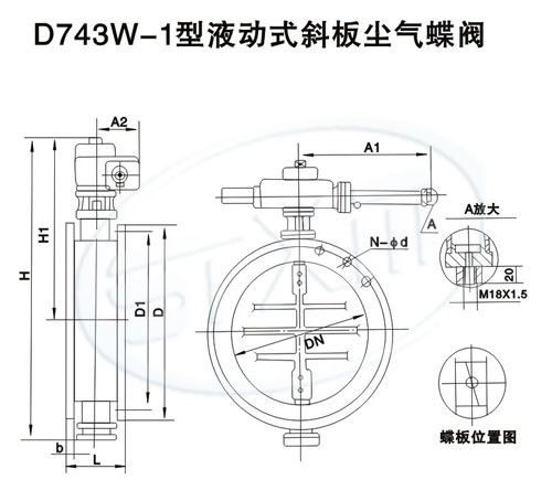 结构特点: D743W-1型液动式尘气蝶阀利用液动装置通过机械执行机驱动蝶板完成启闭动作。蝶板工作位置可通过行程开关进行信号显示。阀门启闭速度可用节流阀调节。本阀可以远距离单独控制,也可以集中控制。还可将电信号输入计算机进行程序控制。本阀在非正常情况下可用扳手进行手动操作。本阀安装于水平管道时请参照图中所示确定安装方向,防止尘灰堆积增加阀门开启阻力。