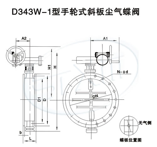 结构特点: D343W-1型手轮式尘气蝶阀采用手轮和传动箱驱动完成阀门启闭,与手柄式蝶阀相比是比较省力的阀门。本阀传动箱盖上装有指针,可以在现场观察蝶板工作位置。本阀安装于水平管道时请参照图中所示确定安装方向。以防止尘灰堆积增加阀门开启阻力。