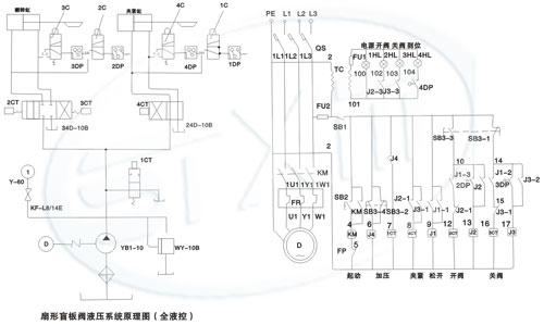 YYZ·D-10型电动液压站是与液动式扇形盲板阀配套使用的专用液压站。液压站的电器控制元件均安装在液压站配电箱内。液压站电源3N-380V,50HZ.控制回路变压器“BK”供给电压220V。操作元件集中在液压站面板上,行程开关1XK、2XK、3XK、4XK分别安装在盲板阀上。液压站具有手动、电动两种功能。手动(手动操作按钮)主要用于调试。电动(由电器控制自动完成分步动作)功能用于正常使用。本液压站的工作原理和使用方法详见说明书。