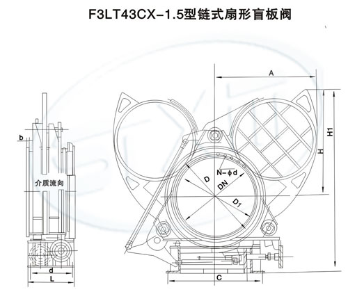 F3LT43CX-1.5,DN800-1400型链式扇形盲板阀是F43CX-1.5型的基础上设置两套由环链驱动的螺旋推杆。用手拉动环链,通过丝杆螺旋付及连杆装置驱动阀体及阀板完成松开、夹紧动作和阀板翻转动作。本阀可以在离管道一定距离的位置进行操作,高空管道可在地面操作,提高了安全性。本阀为长结构系列,阀体带有伸缩器。安装时请参照图示确定安装方向。