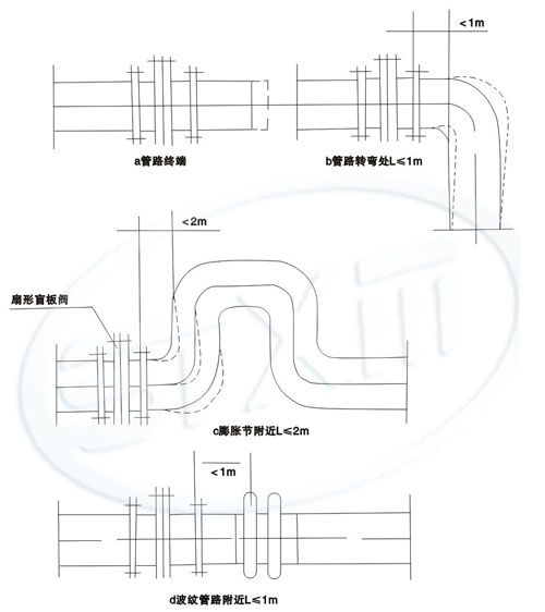 F43X-1.5、F43AX-1.5型扇形盲板阀在开启时左、右阀体应用16~20mm的轴向位移。因此,管路在阀门启闭过程中也应具有满足上述位移的弹性变形或位移。建议按下述形式安装。其余型号的手动扇形盲板阀在能够保证管道外力不作用在阀门上的情况下,对安装位置不做规定。