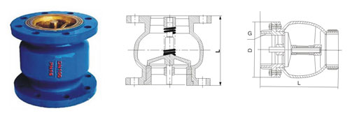 本厂生产的GFH41 型消声止回阀。适用于给、排水管道,阀瓣采用进出口两端中心轴导向,启闭灵活,可水平安装或垂直安装,阀瓣采用弹簧加载,其快速关闭能有效地减少水锤压力,密封性能好,关闭无噪声,它具有体积小,重量轻、流体阻力小、耐疲劳、寿命长等优点。