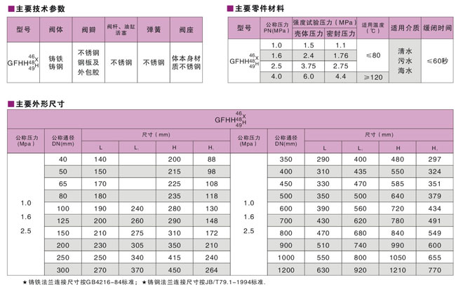 本厂生产的GFHH 46/48/49X/H 消声缓闭止回阀系列产品可用在清水、污水、海水等介质的排水管道上,既能防止介质的倒流,又能有效的限制破坏性水锤,保证管线的使用安全。它具有结构新颖、体积小、重量轻、流体阻力小、密封可靠、启闭平稳、耐磨损、使用寿命长,油压、缓闭不受介质影响,有效好节能效果等特点。